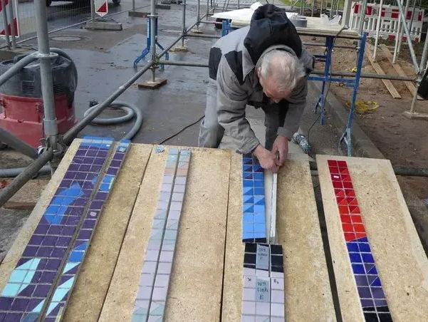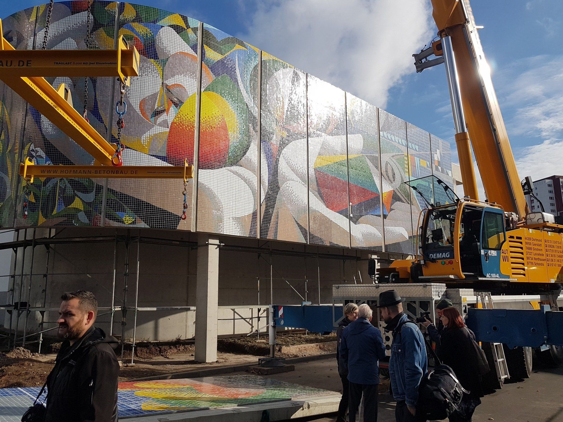 Instandsetzung des Mosaiks von Joseph Renau, Herstellung einer Betonunterkonstruktuktion, Aufbringung des Mosaiks auf die Betonunterkonstruktion und Aufstellung.